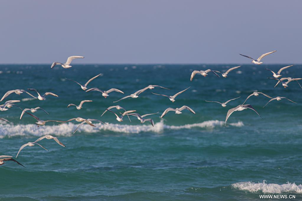 غزة 20 فبراير 2023 (شينخوا) في الصورة الملتقطة يوم 18 فبراير 2023، طيور النورس تحلق فوق البحر المتوسط بالقرب من مدينة غزة.