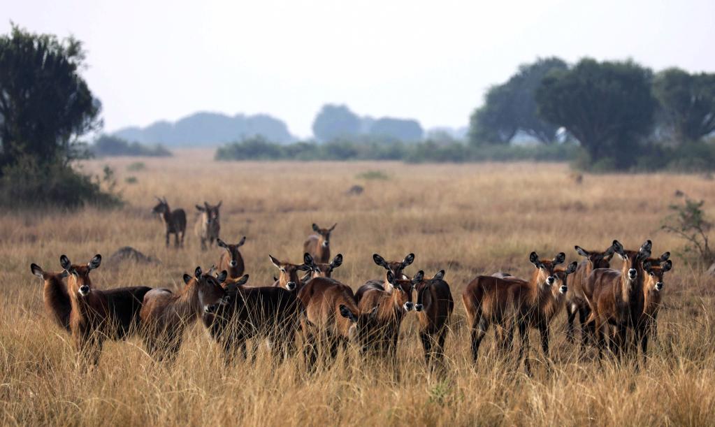 كاسيسي 3 مارس 2023 (شينخوا) في الصورة الملتقطة يوم 2 مارس 2023، قطيع من حيوانات ظبي الماء في حديقة الملكة إليزابيث الوطنية في كاسيسي، غربي أوغندا.