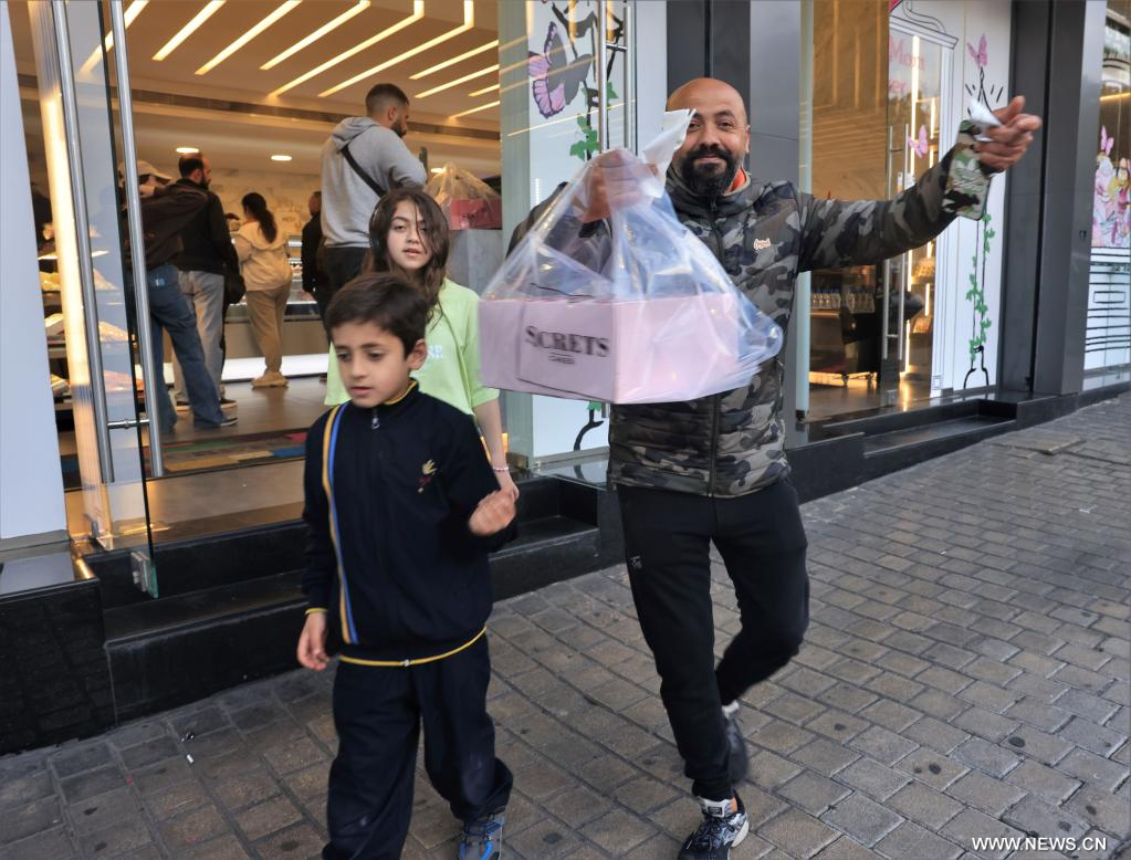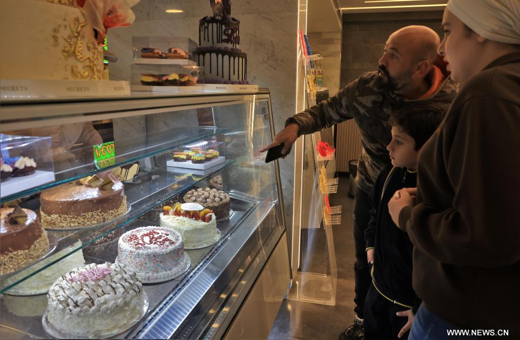 بيروت 22 مارس 2023 (شينخوا) في الصورة الملتقطة يوم 21 مارس 2023، مواطنون يختارون كعكات بمناسبة الاحتفال بعيد الأم، من أحد المحلات في العاصمة اللبنانية بيروت، حيث يحتفل السكان المحليون بعيد الأم يوم 21 مارس من كل عام.