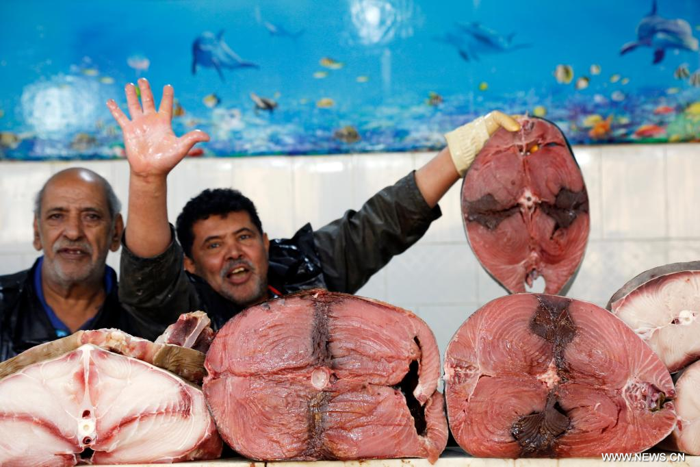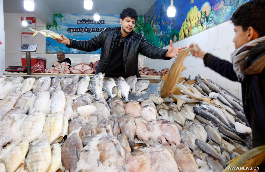 صنعاء 23 مارس 2023 (شينخوا) في الصورة الملتقطة يوم 7 مارس 2023، تجار السمك يبيعون الأسماك في سوق في صنعاء، اليمن. منذ أن فرضت الحكومة اليمنية حظرا على صادرات الأسماك في فبراير، الذي كان يهدف إلى التخفيف من نقص الغذاء وتحقيق الاستقرار في الأسعار المحلية، شهدت أسواق الأسماك في جميع أنحاء البلاد التي مزقتها الحرب انخفاضا حادا في الأسعار وانتعاشا في المبيعات. ومع ذلك، فإن الإجراء حسن النية أثار غضب الصيادين في البلاد.