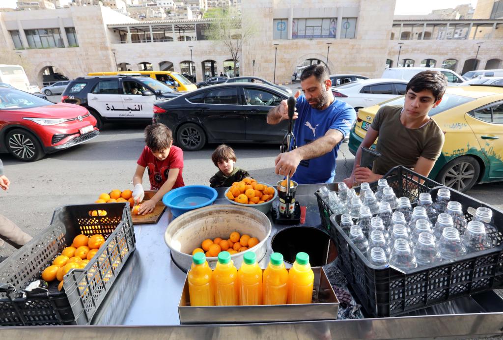 عمَّان 24 مارس 2023 (شينخوا) في الصورة الملتقطة يوم 24 مارس 2023، رجل يصنع عصائر خلال شهر رمضان في إحدى أسواق العاصمة الأردنية عمَّان.