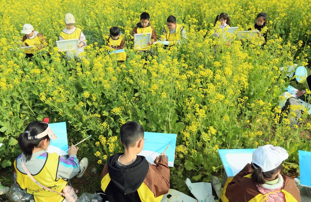 رويانغ 2 أبريل 2023 (شينخوا) في الصورة الملتطقة أول أبريل 2023، طلاب من المدارس الابتدائية يرسمون مناظر خلابة لحقول أزهار السلجم في محافظة رويانغ بمقاطعة خنان وسط الصين.