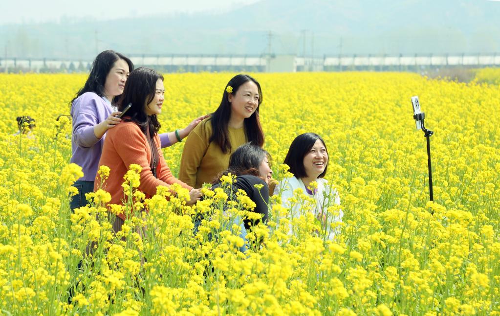 رويانغ 2 أبريل 2023 (شينخوا) في الصورة الملتطقة أول أبريل 2023، سياح يلتقطون صورة جماعية في حقول أزهار السلجم في محافظة رويانغ بمقاطعة خنان وسط الصين.