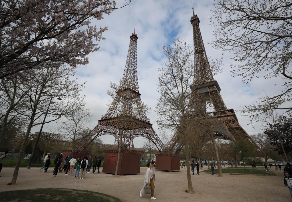 باريس 3 أبريل 2023 (شينخوا) في الصورة الملتقطة يوم 3 أبريل 2023، برج إيفل والنسخة المصغرة منه، وهي عشر حجم هيكل البرج الأصلي، في باريس، فرنسا.