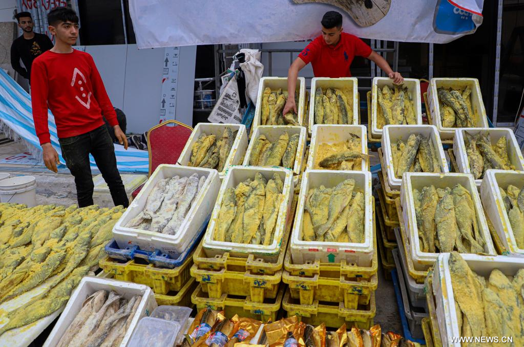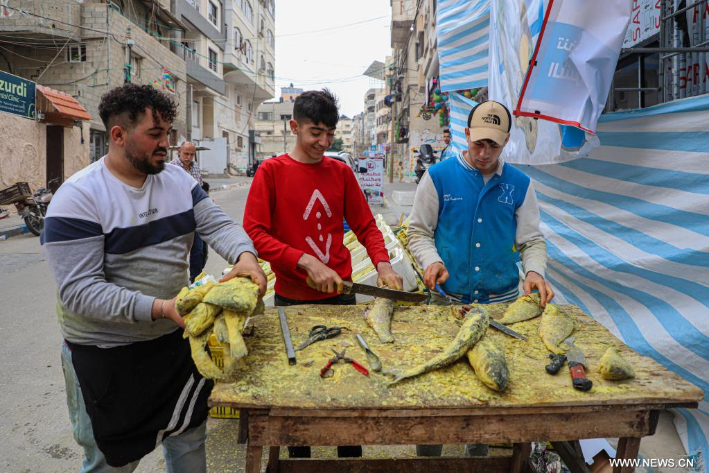 غزة 19 أبريل 2023 (شينخوا) في الصورة الملتقطة يوم 19 أبريل 2023، بائعون فلسطينيون يبيعون السمك المملح المعروف باسم الفسيخ في سوق قبيل عيد الفطر بمدينة غزة.