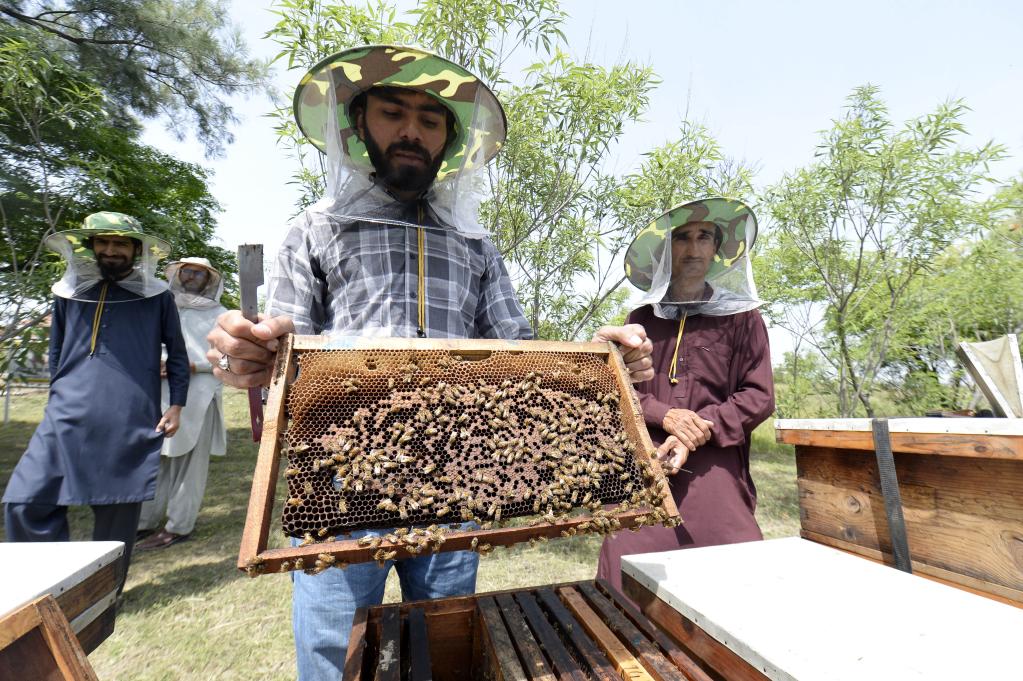 شاكوال 21 مايو 2023 (شينخوا) في الصورة الملتقطة يوم 11 أبريل 2023، رجل يعرض إطار خلية نحل في مزرعة أبحاث في منطقة شاكوال بمقاطعة البنجاب بباكستان.