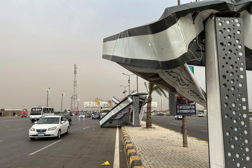 القاهرة أول يونيو 2023 (شينخوا) في الصورة الملتقطة يوم أول يونيو 2023، لوحات إعلانية سقطت جراء عاصفة رملية في القاهرة، مصر. وقد لقي شخص مصرعه وأصيب خمسة آخرون في العاصمة المصرية القاهرة جراء عاصفة رملية شديدة ضربت عدة مناطق في مصر اليوم (الخميس).