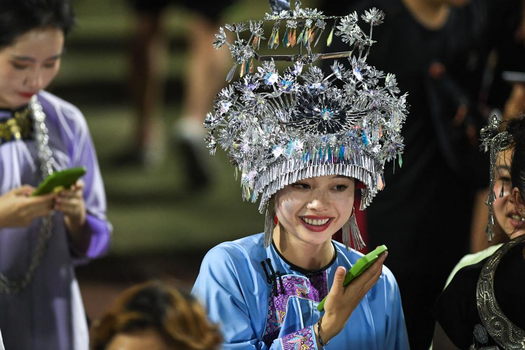 رونغجيانغ 18 يونيو 2023 (شينخوا) في الصورة الملتقطة يوم 17 يونيو 2023، نساء قرويات ترتدين ملابس قومية احتفالية خلال مبارة كرة القدم في "دوري السوبر القروي" في محافظة رونغجيانغ في مقاطعة قويتشو جنوب غربي الصين. ترتدي النساء القرويات الفساتين القومية ويقمن بالغناء والرقص في كل مباراة في العطلات الأسبوعية.