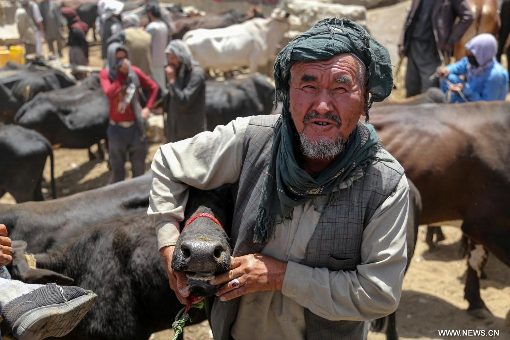 كابول 25 يونيو 2023 (شينخوا) في الصورة الملتقطة يوم 25 يونيو 2023، رجل ينتظر بيع ماشيته في إحدى أسواق الماشية قبيل عيد الأضحى المبارك في العاصمة الأفغانية كابول. سيبدأ عيد الأضحى، الذي يعتبر أحد أهم العطلات الإسلامية، في 28 يونيو من العام الجاري.