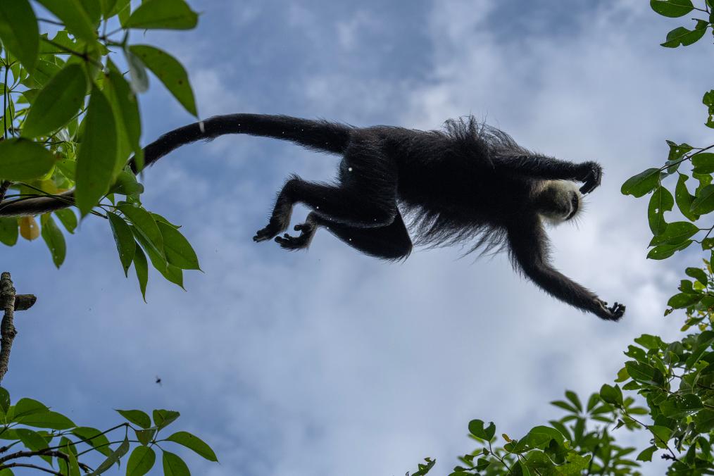 تشونغتسوه 8 أغسطس 2023 (شينخوا) في الصورة الملتقطة يوم 5 أغسطس 2023، مشهد لقرد اللانجور أبيض الرأس وهو يقفز داخل محمية طبيعية وطنية في بلدة لوهباي في حي جيانغتشو بمدينة تشونغتسوه في منطقة قوانغشي ذاتية الحكم لقومية تشوانغ في جنوبي الصين. ويعد قرد اللانجور أبيض الرأس أحد أكثر أنواع الرئيسيات المهددة بالانقراض في العالم ويتواجد بشكل حصري في الصين.