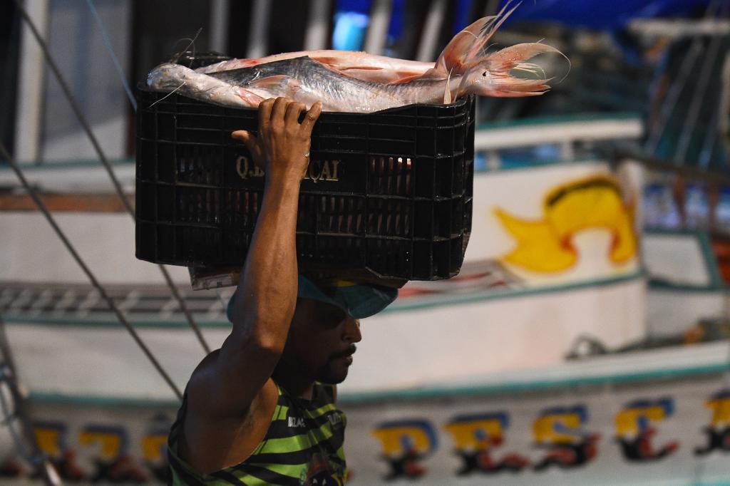 بيليم 10 سبتمبر 2023 (شينخوا) في الصورة الملتقطة يوم 9 سبتمبر 2023، صياد يحمل صندوقا به أسماك في سوق فيرو بيسو للسمك في بيليم في ولاية بارا في البرازيل.