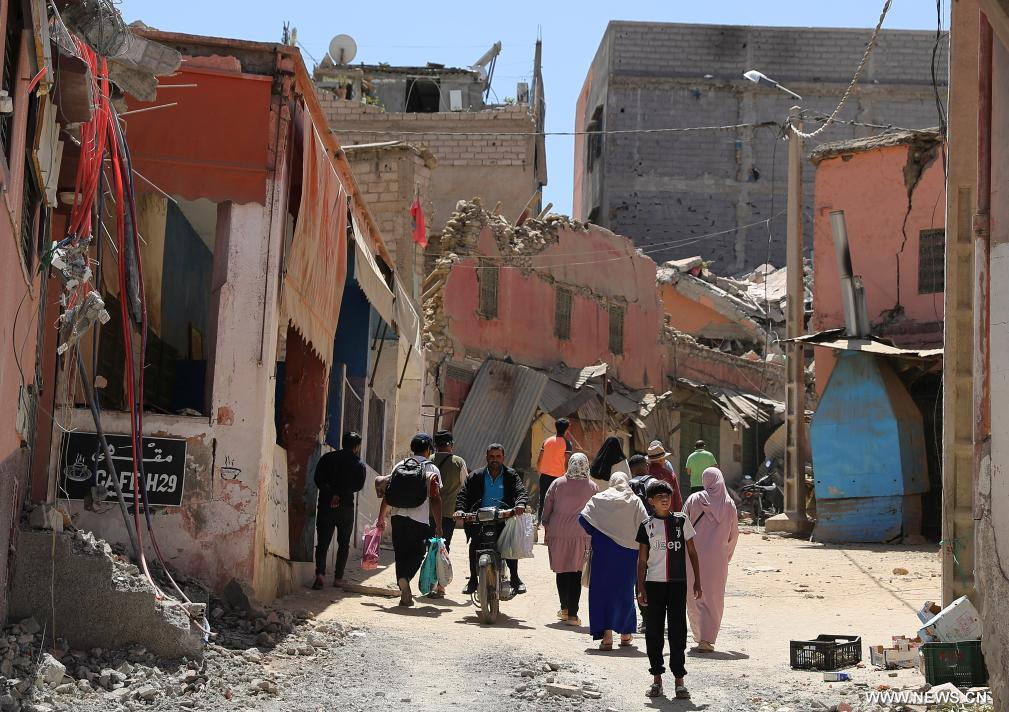 في الصورة الملتقطة يوم 10 سبتمبر 2023، سكان يمرون بجوار المباني المحطمة بسبب الزلزال في قرية أمزميز بالمغرب.