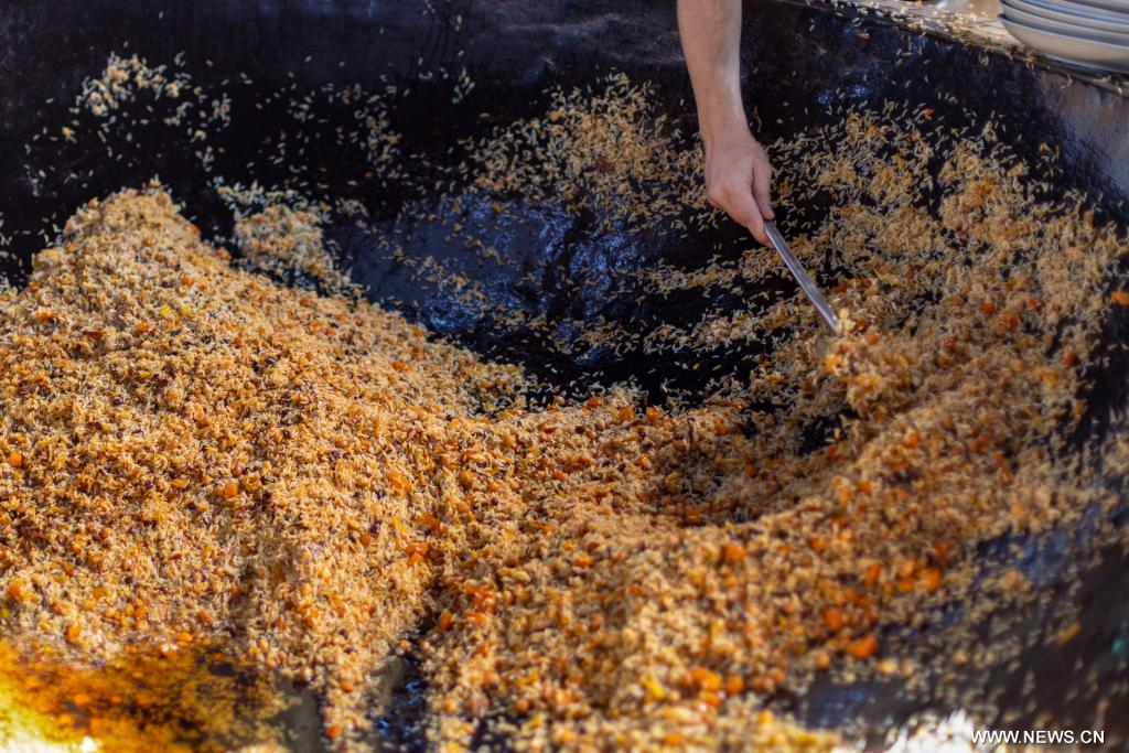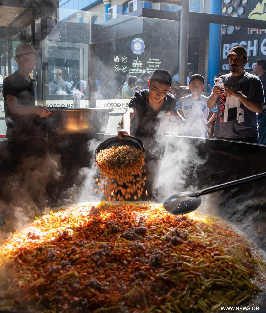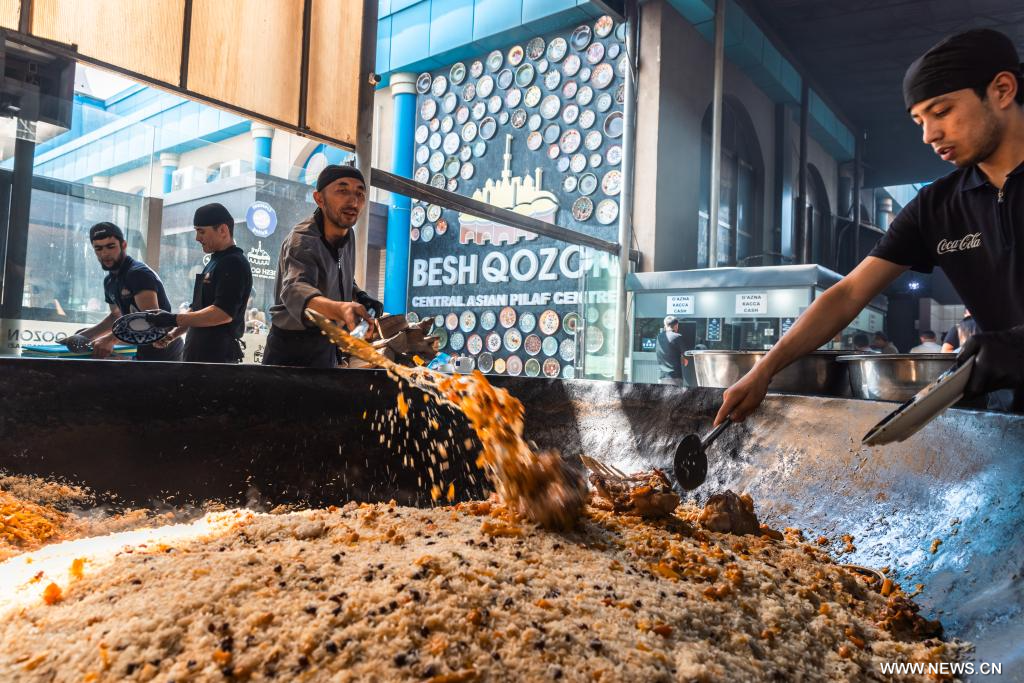 طشقند 15 سبتمبر 2023 (شينخوا) في الصورة الملتقطة يوم 13 سبتمبر 2023، طاه يستعد لتقديم طبق البيلاف في مطعم بيش قوزون في العاصمة الأوزبكية، طشقند. ويتكون طبق البيلاف، وهو طعام أوزبكي تقليدي، من الأرز والجزر ولحم الضأن. وفي بيش قوزون، مطعم شهير بالقرب من برج تلفزيون طشقند، يعد البيلاف الطبق الأكثر رواجا بين رواد المطعم.
