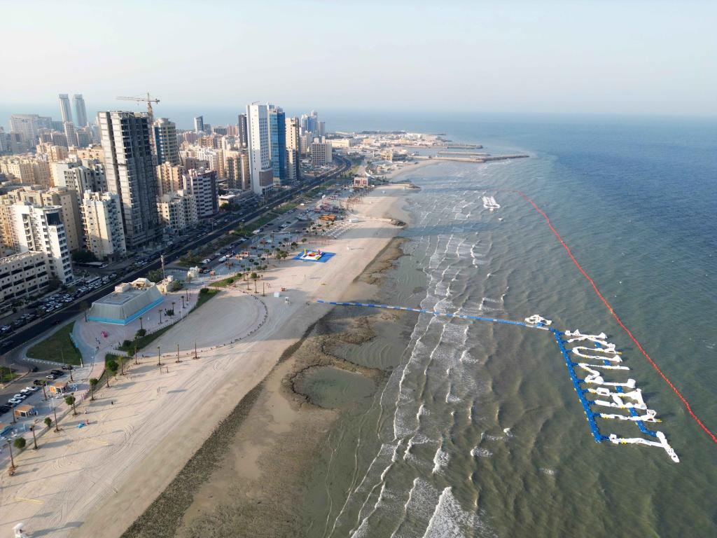 محافظة حولي 27 سبتمبر 2023 (شينخوا) في الصورة الجوية الملتقطة يوم 26 سبتمبر 2023، مشهد لشاطئ البلاجات، الذي افتتح رسميا يوم الثلاثاء، في منطقة السالمية بمحافظة حولي الكويتية.