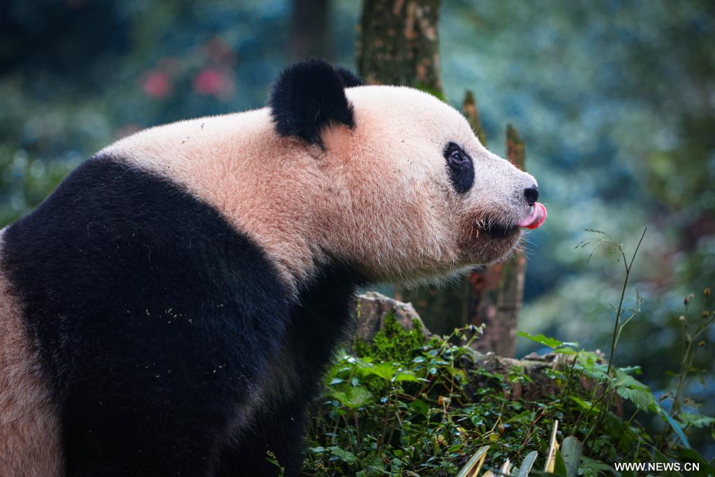 في الصورة الملتقطة يوم 8 أكتوبر 2023، الباندا العملاقة شيانغ شيانغ في قاعدة بيفنغشيا للباندا العملاقة في ياآن بمقاطعة سيتشوان جنوب غربي الصين. والتقت الباندا العملاقة الأنثى شيانغ شيانغ بالجمهور في قاعدة بيفنغشيا للباندا العملاقة يوم الأحد الماضي.