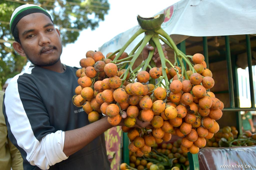 كوكس بازار 29 نوفمبر 2023 (شينخوا) في الصورة الملتقطة يوم 25 نوفمبر 2023، مزارع يعرض ثمار جوز التنبول المحصودة حديثا في سوق في مدينة كوكس بازار في بنجلاديش.