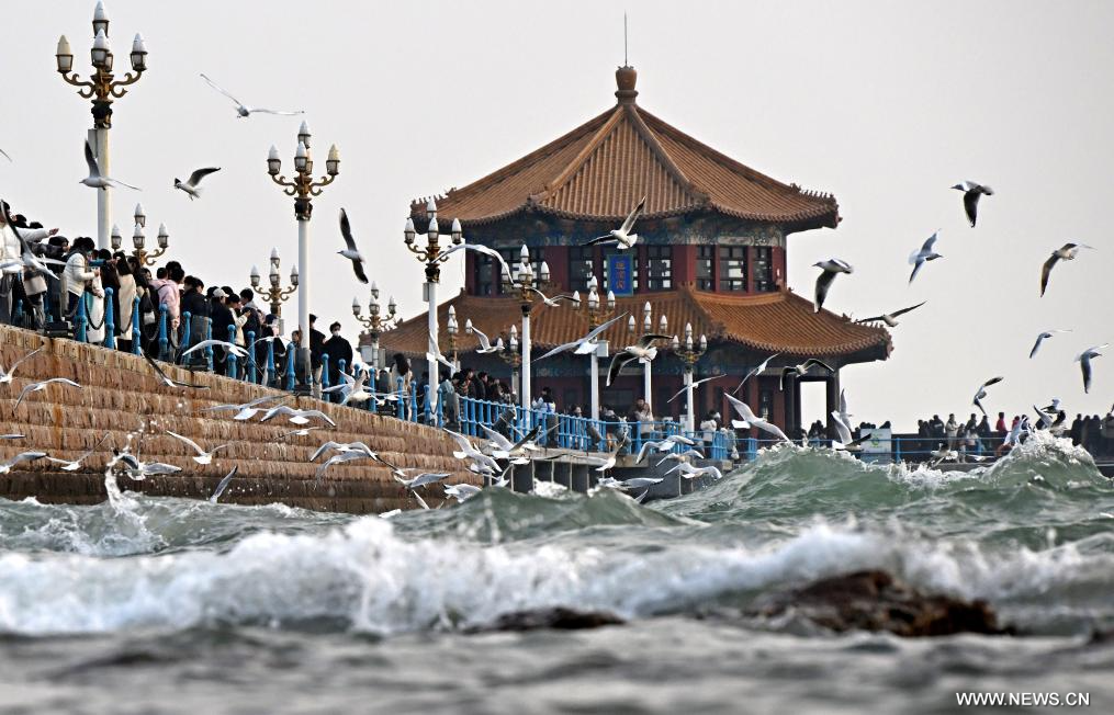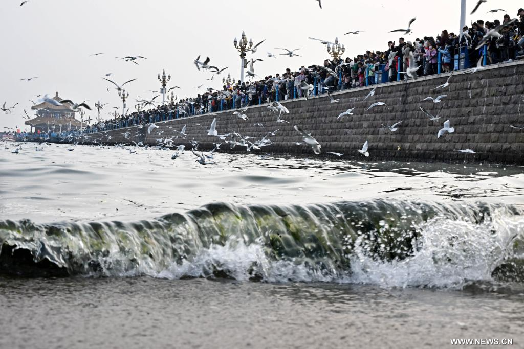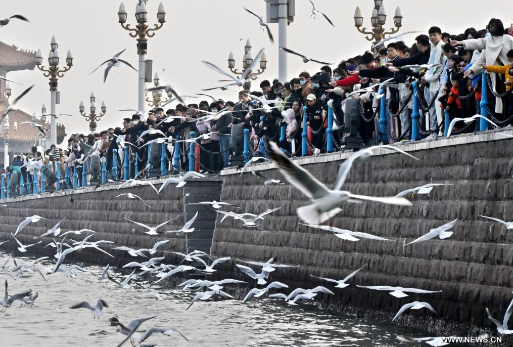 تشينغداو 10 ديسمبر 2023 (شينخوا) في الصورة الملتقطة يوم 9 ديسمبر 2023، أناس يشاهدون طيور النورس في منطقة جسر تشانتشياو السياحية في مدينة تشينغداو الساحلية بمقاطعة شاندونغ شرقي الصين.