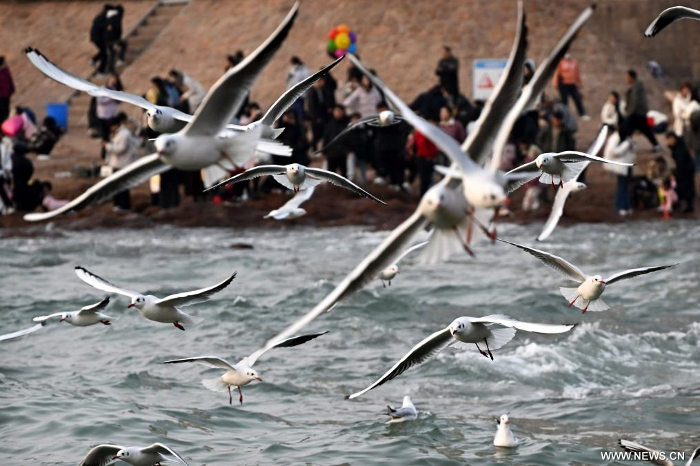 مشهد لطيور النورس في مدينة تشينغداو شرقي الصين