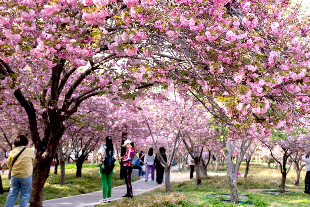 خبي 8 أبريل 2024 (شينخوا) في الصورة الملتقطة يوم 7 أبريل 2024، زوار يشاهدون أزهار الكرز في مدينة خبي في مقاطعة خنان بوسط الصين.