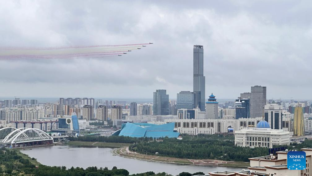 أستانا 3 يوليو 2024 (شينخوا) أطلقت طائرات مقاتلة خطوطا دخانية بألوان العلم الصيني في سماء كازاخستان أثناء إقامة الرئيس الكازاخي قاسم جومارت توكاييف اليوم (الأربعاء) حفل استقبال للرئيس الصيني الزائر شي جين بينغ.