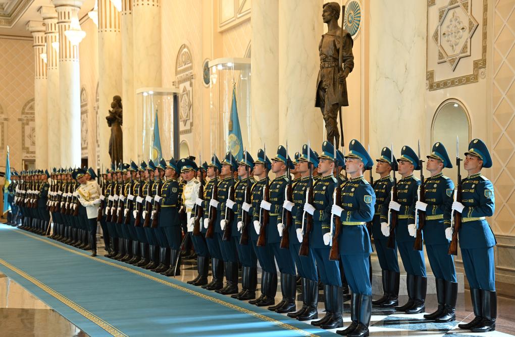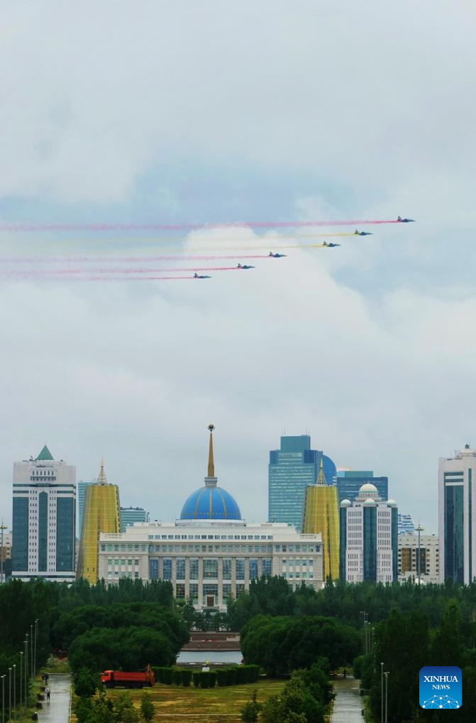 وأقلعت ثلاث طائرات مقاتلة تابعة للقوات الجوية الكازاخية لمرافقة طائرة شي الرئاسية بعد دخولها المجال الجوي للبلاد. وأقام توكاييف حفل استقبال كبير للرئيس شي في المطار.