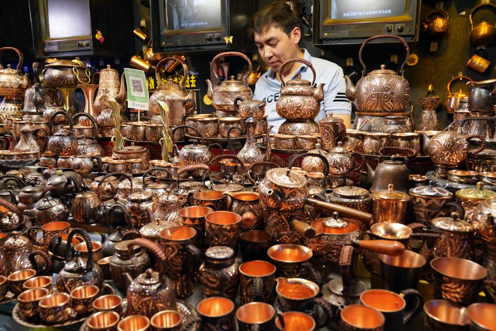 كاشغار 25 سبتمبر 2024 (شينخوا) في الصورة الملتقطة يوم 19 سبتمبر 2024، متجر للمنتجات النحاسية في مدينة كاشغار القديمة في منطقة شينجيانغ الويغورية ذاتية الحكم بشمال غربي الصين. وتتمتع مدينة كاشغار القديمة، وهي محطة مهمة على طريق الحرير القديم، بآثار تاريخية وثقافية غنية.