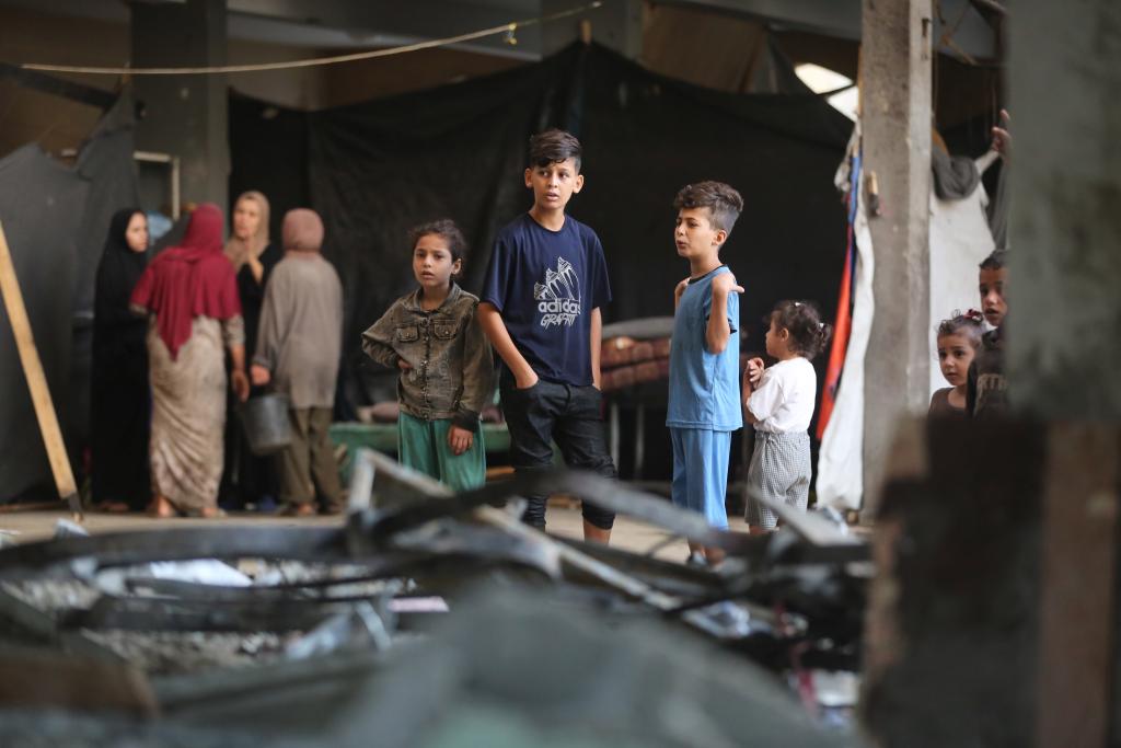 فلسطينيون يتفقدون الأضرار التي لحقت بمدرسة رفيدة التي دمرتها غارة جوية إسرائيلية في مدينة دير البلح بوسط قطاع غزة في 11 أكتوبر 2024.