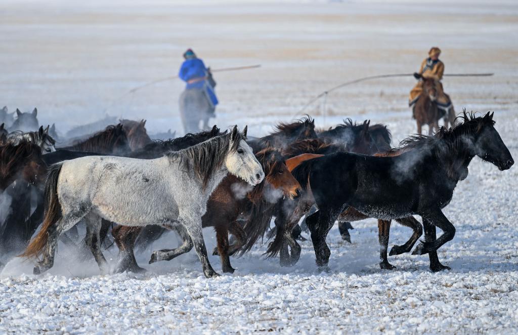 شيلينغول 13 ديسمبر 2024 (شينخوا) في الصورة الملتقطة يوم 12 ديسمبر 2024، خيول في المروج المغطاة بالثلوج في شيلينغول بمنطقة منغوليا الداخلية ذاتية الحكم بشمالي الصين.
