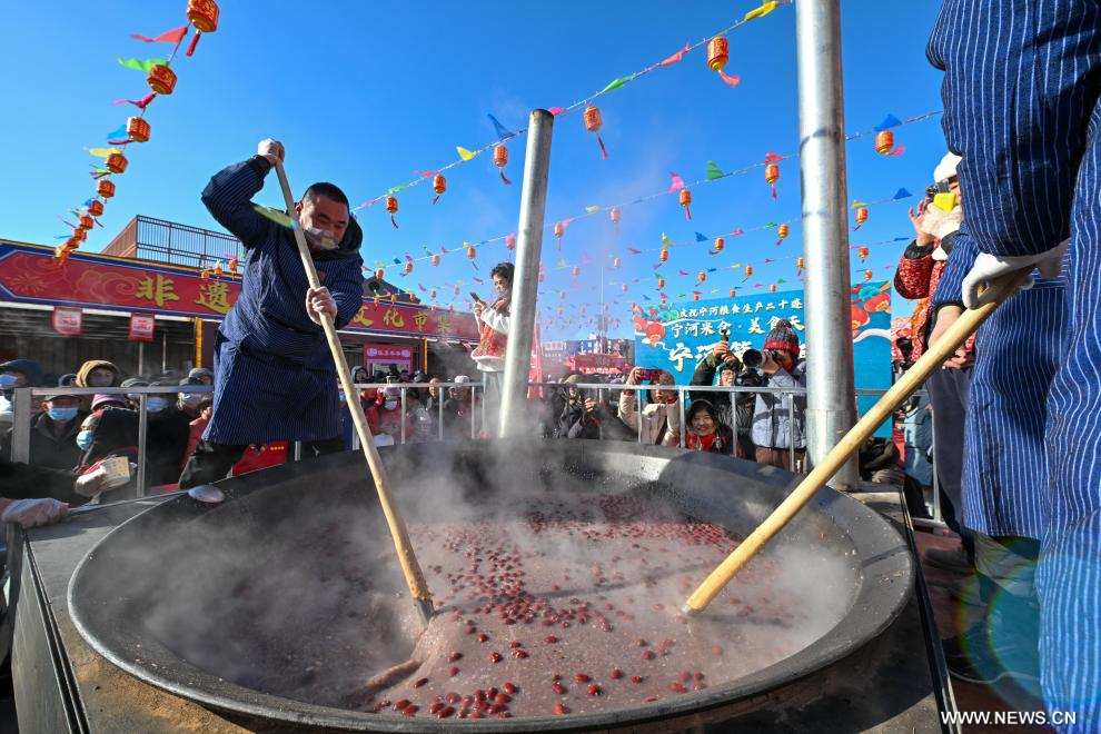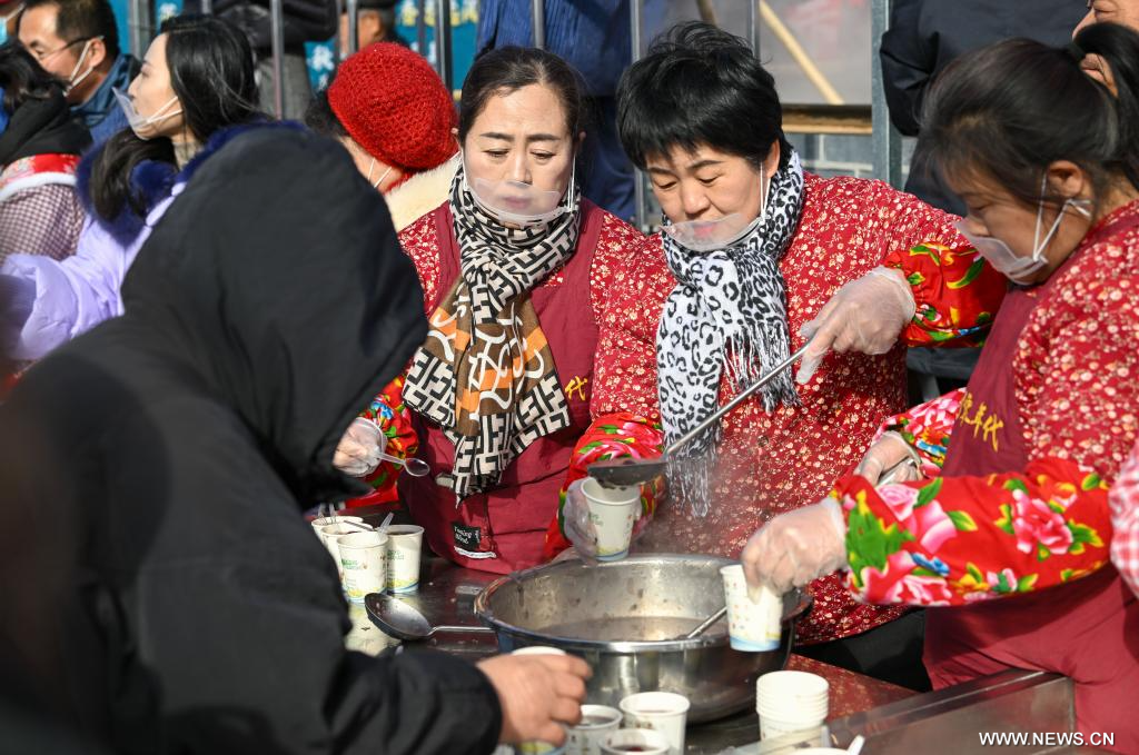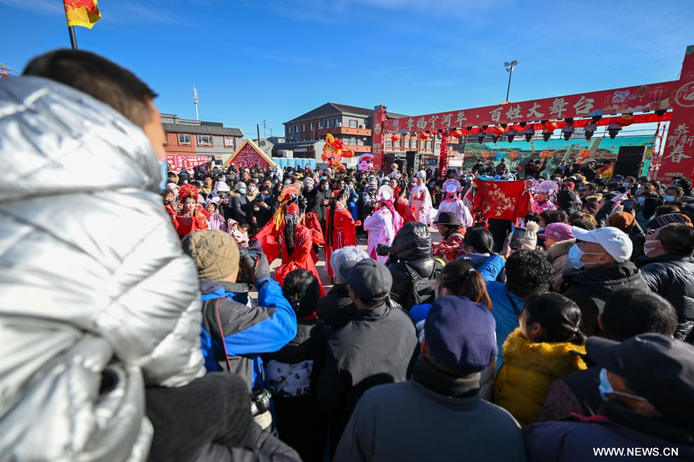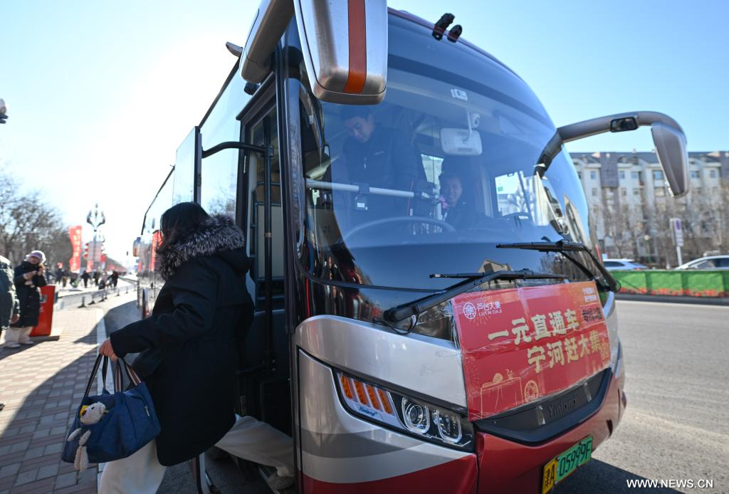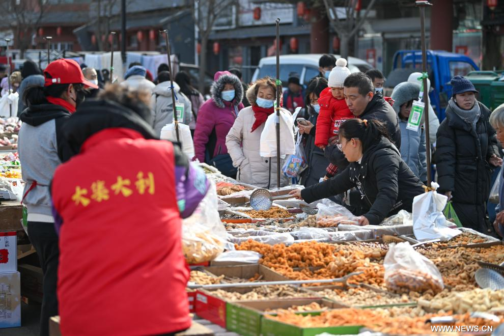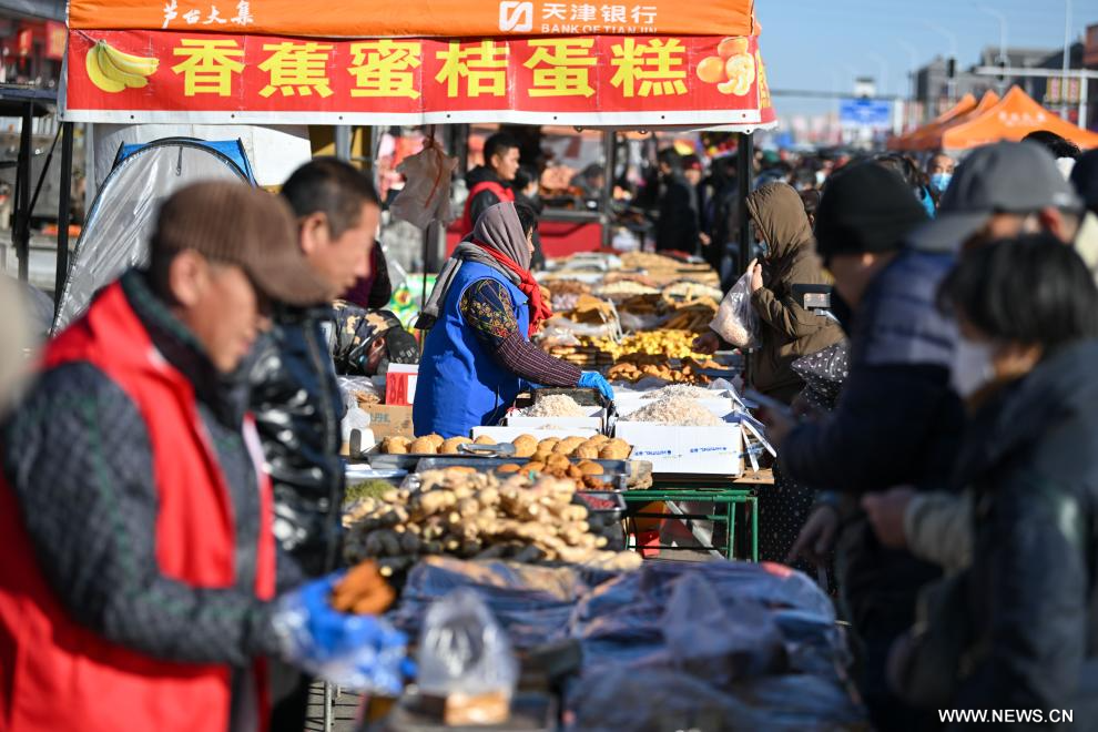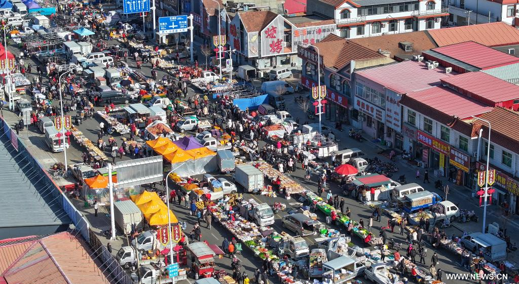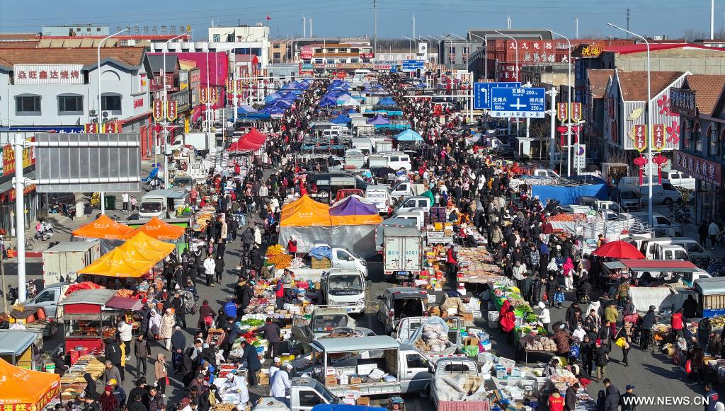 تيانجين 7 يناير 2025 (شينخوا) في الصورة الجوية الملتقطة بطائرة بدون طيار يوم 7 يناير 2025، أناس يرتادون سوقا مقامة في الهواء الطلق في حي نينغخه ببلدية تيانجين شمالي الصين. ويعود تاريخ السوق إلى حوالي 350 عاما، وهي إحدى أكبر الأسواق الريفية في تيانجين.