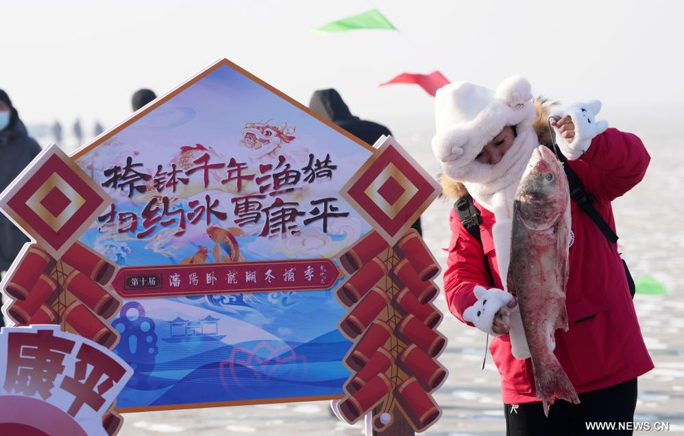 شنيانغ 12 يناير 2025 (شينخوا) في الصورة الملتقطة يوم 11 يناير 2025، زائرة تلتقط صورة مع سمكة تم اصطيادها في بحيرة وولونغ بمدينة شنيانغ حاضرة مقاطعة لياونينغ شمال شرقي الصين.