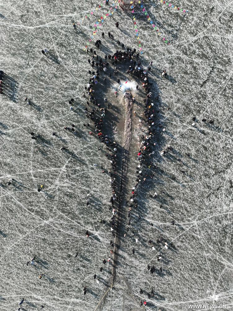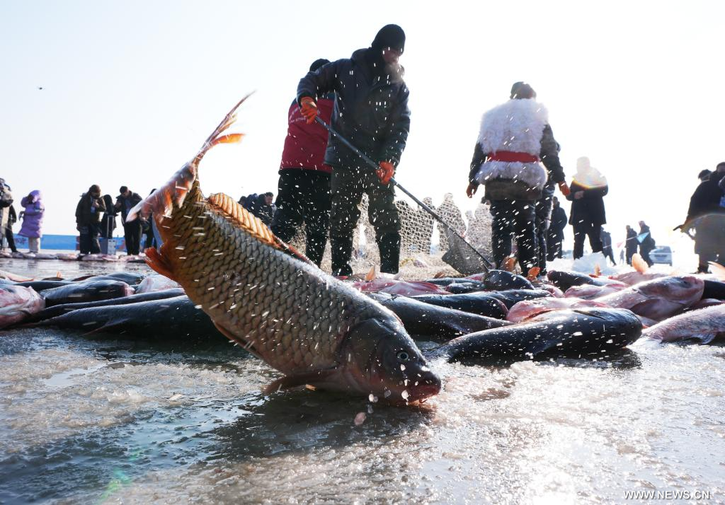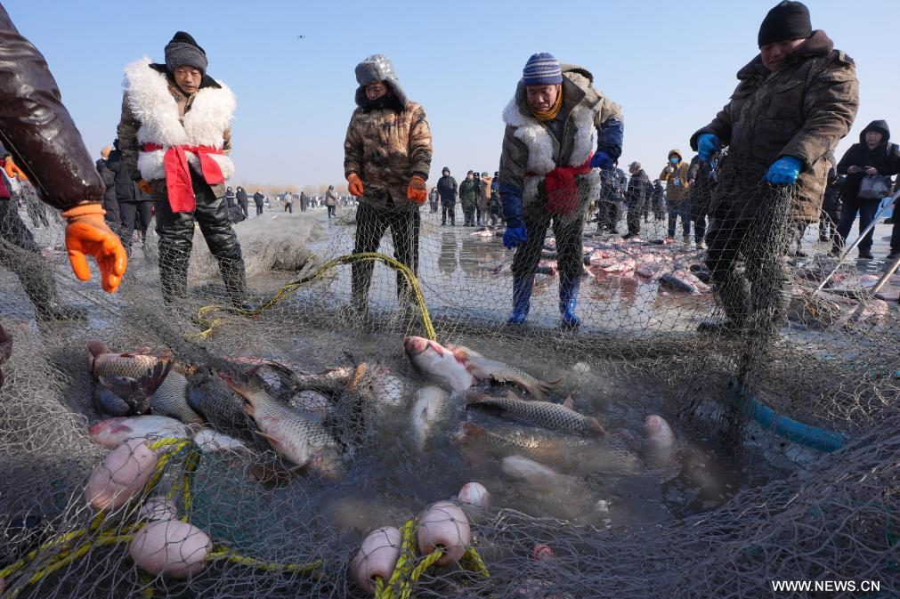شنيانغ 12 يناير 2025 (شينخوا) في الصورة الملتقطة جوا يوم 11 يناير 2025، أشخاص يشاركون في فعالية صيد الأسماك في بحيرة وولونغ في مدينة شنيانغ، حاضرة مقاطعة لياونينغ شمال شرقي الصين.