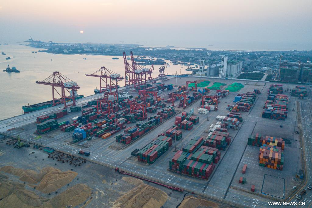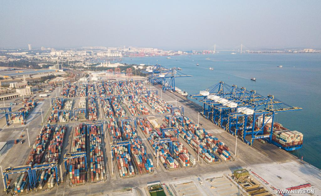 يانغبو 13 يناير 2025 (شينخوا) في الصورة الملتقطة جوا يوم 11 يناير 2025، جانب من ميناء يانغبو الدولي للحاويات في منطقة يانغبو للتنمية الاقتصادية في مدينة دانتشو بمقاطعة هاينان جنوبي الصين.