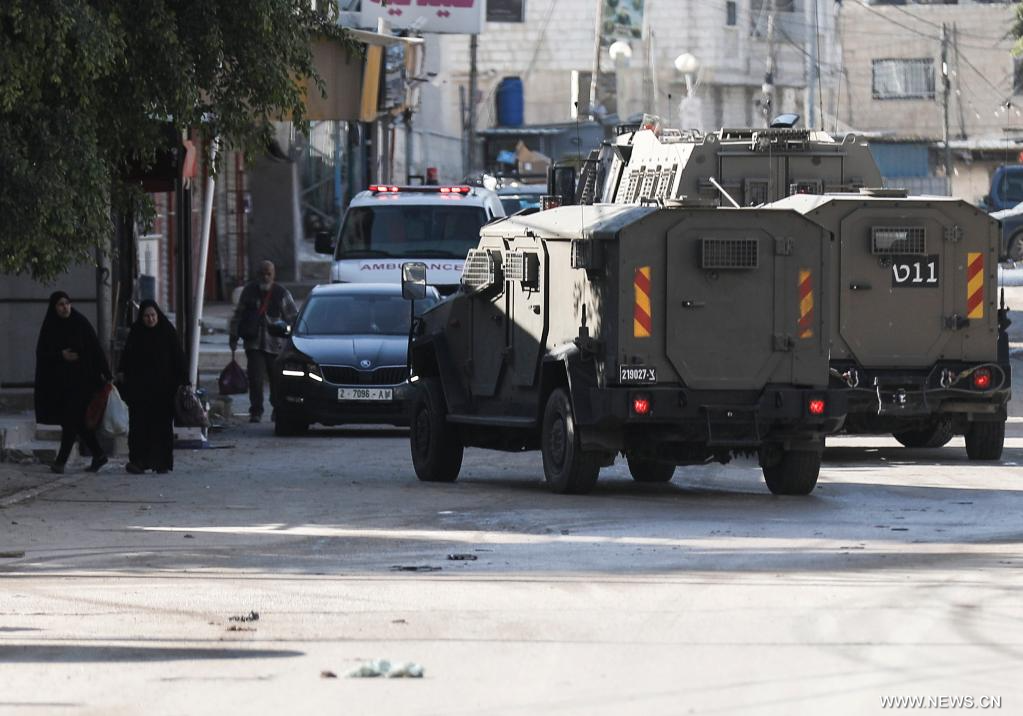جنين 21 يناير 2025 (شينخوا) في الصورة الملتقطة يوم 21 يناير 2025، مركبات عسكرية إسرائيلية خلال عملية عسكرية إسرائيلية في مدينة جنين بالضفة الغربية.