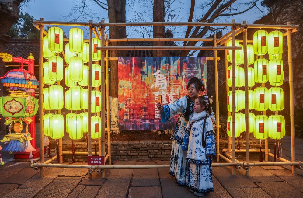 تونغشيانغ 25 يناير 2025 (شينخوا) في الصورة الملتقطة يوم 23 يناير 2025، سائحتان في الزي التقليدي تلتقطان صورا "سيلفي" مع الفوانيس خلال مهرجان الفوانيس العائمة في بلدة ووتشن بمقاطعة تشجيانغ شرقي الصين. انطلق مهرجان الفوانيس، الذي تستمر فعالياته 21 يوما، هنا يوم الخميس، عارضا فوانيس ملونة إلى جانب ولائم الشوارع والأسواق المائية، وعروض التراث الثقافي غير المادي.