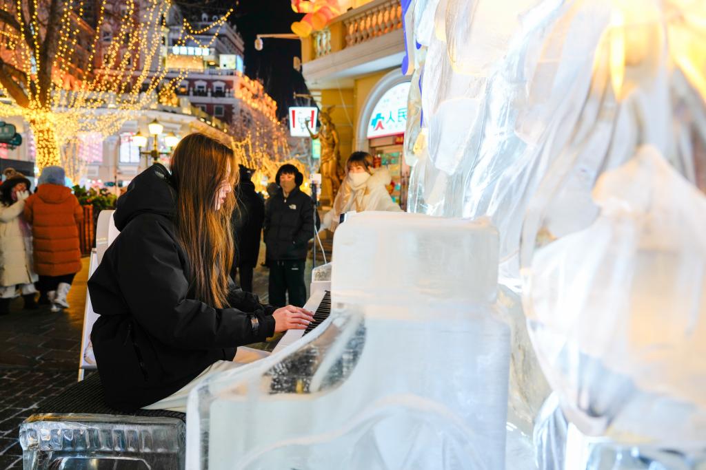 بكين 6 فبراير 2025 (شينخوا) في الصورة الملتقطة يوم 30 يناير 2025، زائرة تعزف على بيانو مزين بالجليد في مدينة هاربين، حاضرة مقاطعة هيلونغجيانغ شمال شرقي الصين. ونجحت العديد من المناطق السياحية في الصين في جذب الكثير من الزوار من خلال تنظيم فعاليات متعلقة بالجليد والثلج.
