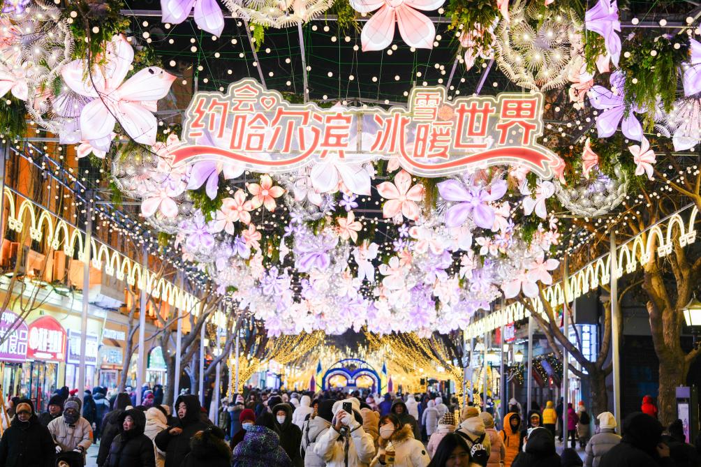 بكين 6 فبراير 2025 (شينخوا) في الصورة الملتقطة يوم 30 يناير 2025، سياح يزورون الشارع الرئيسي في مدينة هاربين، حاضرة مقاطعة هيلونغجيانغ شمال شرقي الصين. ونجحت العديد من المناطق السياحية في الصين في جذب الكثير من الزوار من خلال تنظيم فعاليات متعلقة بالجليد والثلج.
