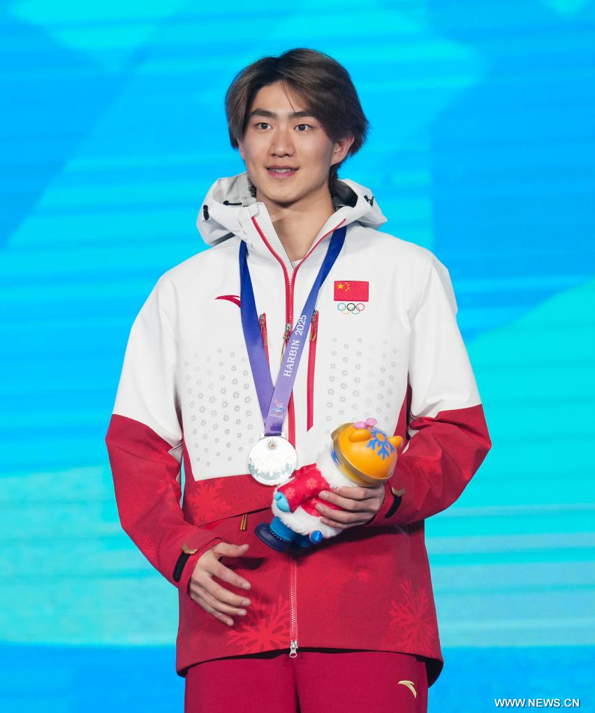 يابولي 10 فبراير 2025 (شينخوا) في الصورة الملتقطة يوم 9 فبراير 2025، الحائز على الميدالية الفضية يانغ لونغ شياو من الصين خلال حفل توزيع جوائز نهائي القفزات الهوائية بمنافسات التزلج الحر للرجال في دورة الألعاب الآسيوية الشتوية التاسعة في يابولي، بمقاطعة هيلونغجيانغ شمال شرقي الصين.