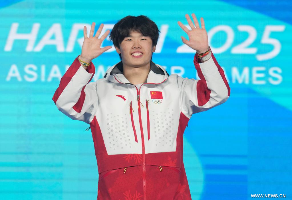 يابولي 10 فبراير 2025 (شينخوا) في الصورة الملتقطة يوم 9 فبراير 2025، الحائز على الميدالية الذهبية لي شين بنغ من الصين خلال حفل توزيع جوائز نهائي القفزات الهوائية بمنافسات التزلج الحر للرجال في دورة الألعاب الآسيوية الشتوية التاسعة في يابولي، بمقاطعة هيلونغجيانغ شمال شرقي الصين.