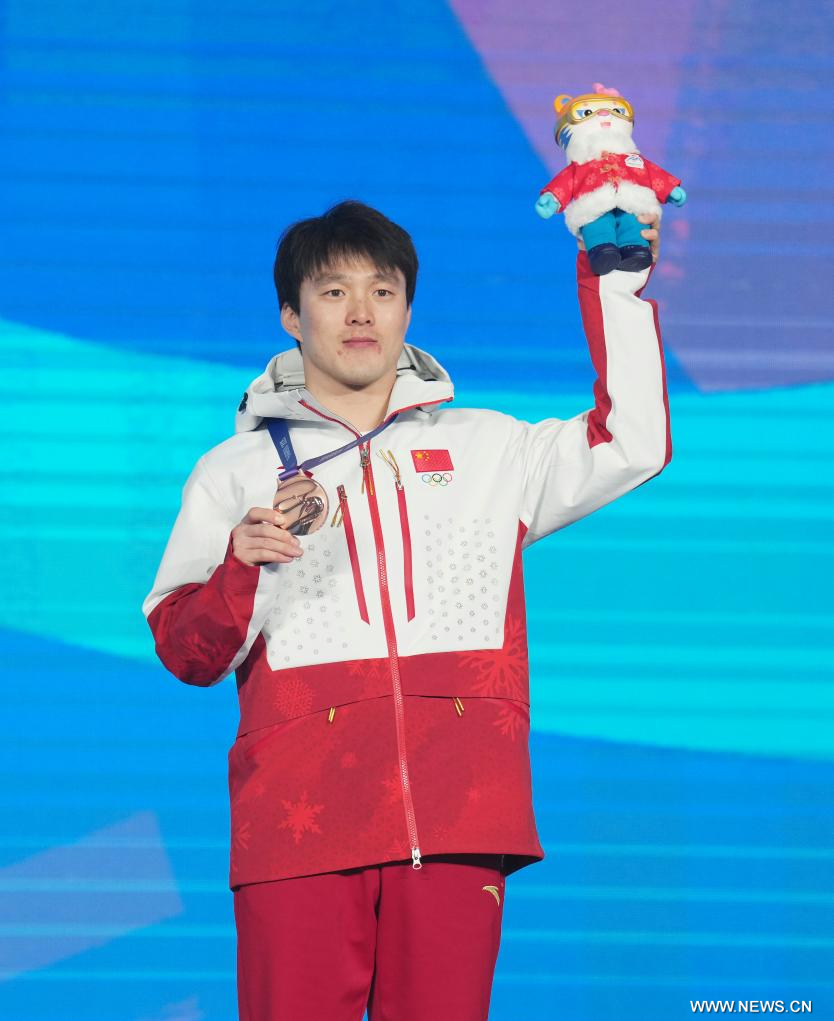يابولي 10 فبراير 2025 (شينخوا) في الصورة الملتقطة يوم 9 فبراير 2025، الحائز على الميدالية البرونزية تشي قوانغ بو من الصين خلال حفل توزيع جوائز نهائي القفزات الهوائية بمنافسات التزلج الحر للرجال في دورة الألعاب الآسيوية الشتوية التاسعة في يابولي، بمقاطعة هيلونغجيانغ شمال شرقي الصين.