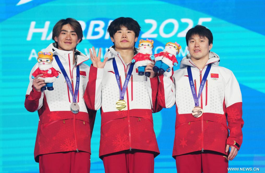 يابولي 10 فبراير 2025 (شينخوا) في الصورة الملتقطة يوم 9 فبراير 2025، الحائز على الميدالية الذهبية لي شين بنغ (في الوسط)، والحائز على الميدالية الفضية يانغ لونغ شياو (على اليسار)، والحائز على الميدالية البرونزية تشي قوانغ بو، وجميعهم من الصين، خلال حفل توزيع جوائز نهائي القفزات الهوائية بمنافسات التزلج الحر للرجال في دورة الألعاب الآسيوية الشتوية التاسعة في يابولي، بمقاطعة هيلونغجيانغ شمال شرقي الصين.