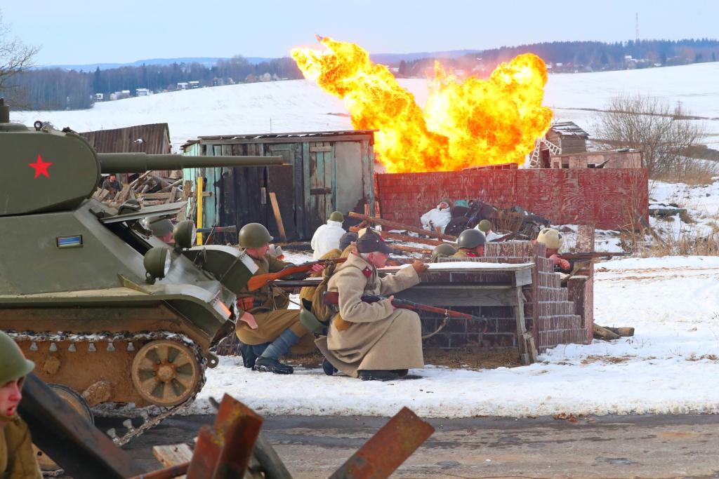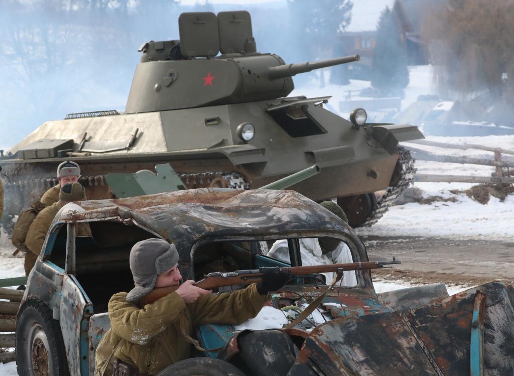 مينسك 23 فبراير 2025 (شينخوا) في الصورة الملتقطة يوم 22 فبراير 2025، ممثلون يقدمون عرضا ضمن فعالية لإعادة تمثيل إحدى معارك الحرب العالمية الثانية يستضيفها متحف في ضواحي مينسك في بيلاروس. ويصادف يوم 23 فبراير الاحتفال بيوم "المُدافع عن أرض الآباء" في بيلاروس.