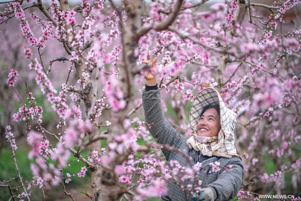 بكين 25 فبراير 2025 (شينخوا) في الصورة الملتقطة يوم 24 فبراير 2025، مزارعة تتفقد أزهار الخوخ في قاعدة لزراعة أشجار الخوخ في ولاية ونشان ذاتية الحكم لقوميتي تشوانغ ومياو بمقاطعة يوننان بجنوب غربي الصين.