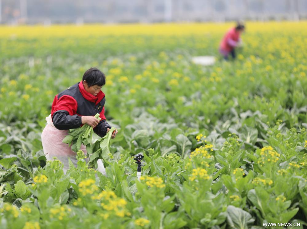 بكين 25 فبراير 2025 (شينخوا) في الصورة الملتقطة يوم 24 فبراير 2025، مزارعة تحصد الخضروات في قاعدة لزراعة الخضروات في مدينة يونغتشو بمقاطعة هونان بوسط الصين.