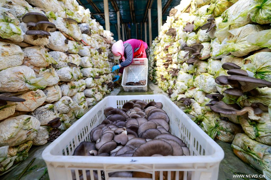 بكين 25 فبراير 2025 (شينخوا) في الصورة الملتقطة يوم 24 فبراير 2025، مزارعة تحصد الفطر في دفيئة في مدينة تانغشان بمقاطعة خبي بشمالي الصين.