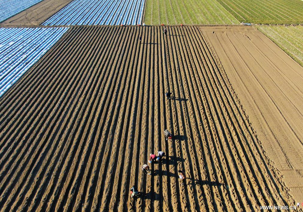 بكين 25 فبراير 2025 (شينخوا) في الصورة الملتقطة جوا يوم 24 فبراير 2025، مزارعون يعملون في حقل لزراعة البطاطس في مدينة لينيي بمقاطعة شاندونغ بشرقي الصين.