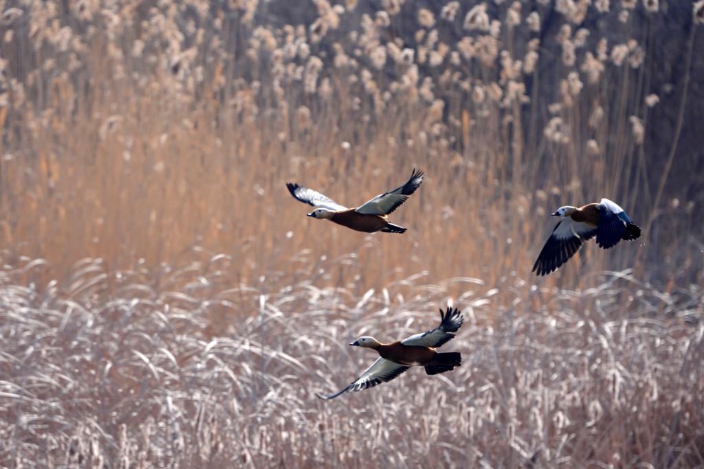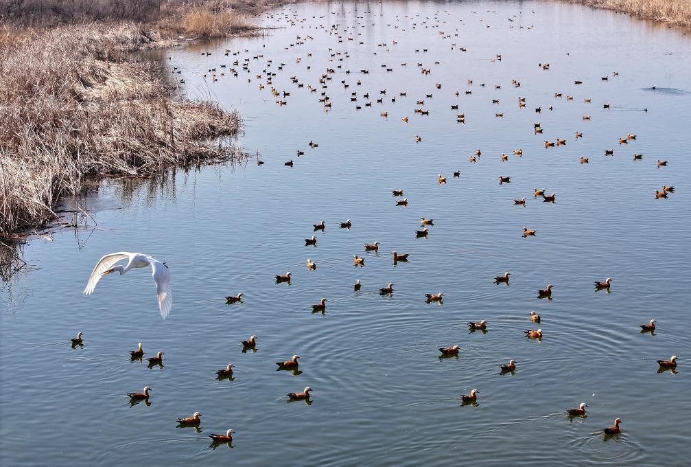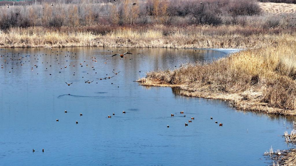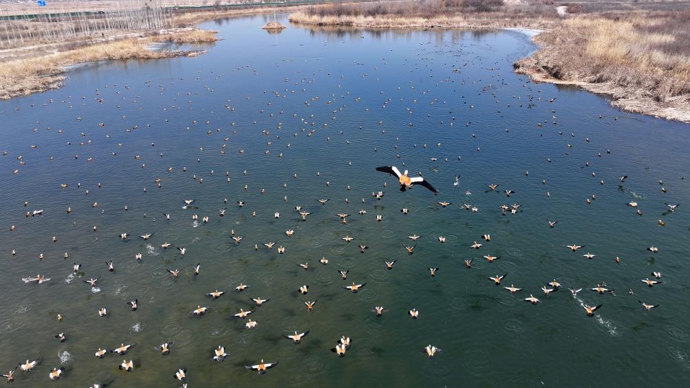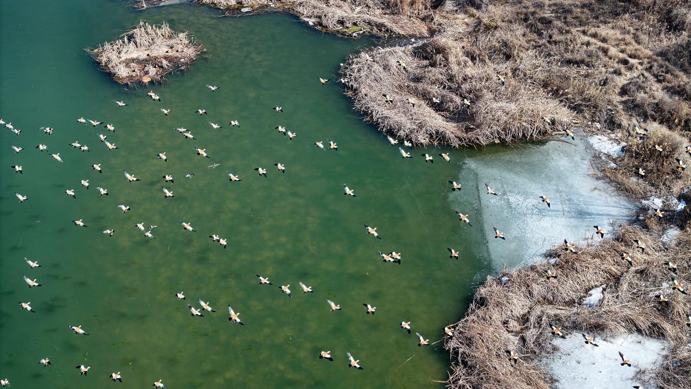 يينتشوان 2 مارس 2025 (شينخوا) في الصورة الملتقطة جوا يوم 26 فبراير 2025، منظر جوي لطيور مهاجرة في أحد المستوطنات على ضفاف قطاع نينغشيا من النهر الأصفر في منطقة نينغشيا الذاتية الحكم لقومية هوي في شمال غربي الصين.