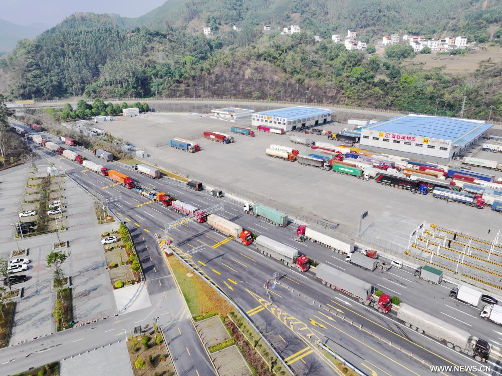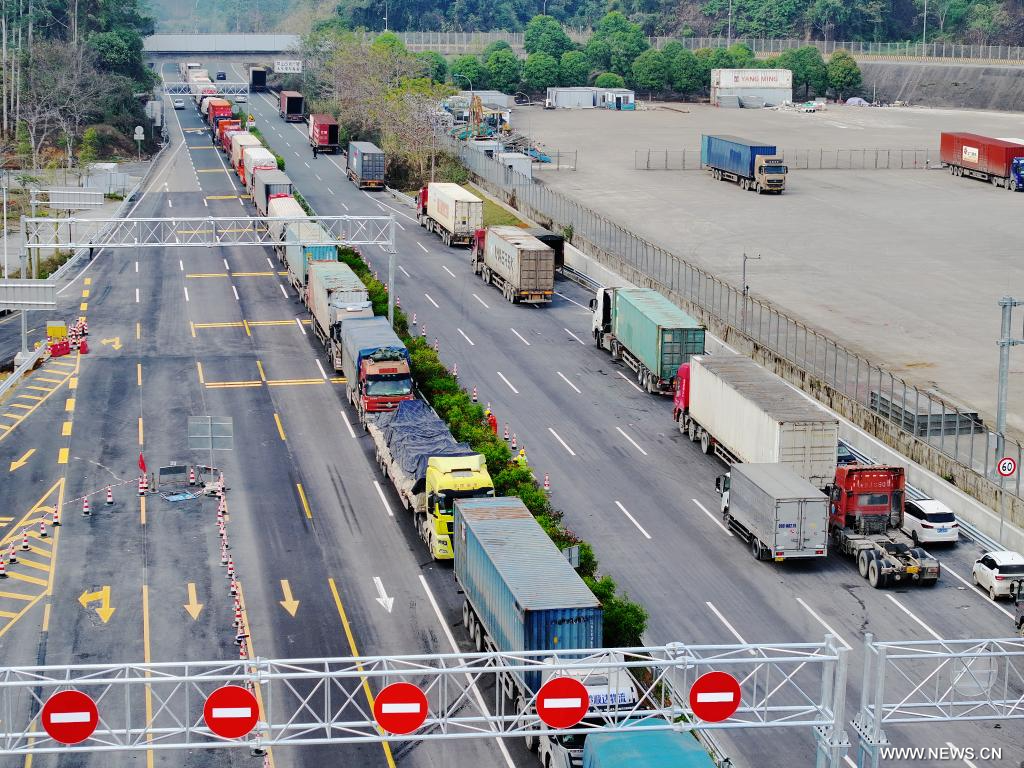 ناننينغ 3 مارس 2025 (شينخوا) في الصورة الملتقطة جوا أول مارس 2025، شاحنات تنتظر المرور عبر ميناء يوييقوان، أو ممر الصداقة، في مدينة بينغشيانغ بمنطقة قوانغشي ذاتية الحكم لقومية تشوانغ بجنوبي الصين.