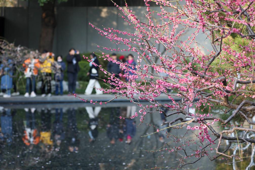 بكين 9 مارس 2025 (شينخوا) في الصورة الملتقطة يوم 8 مارس 2025، زوار يلتقطون صورا للزهور في معبد تيهفوه في مدينة هوتشو بمقاطعة تشجيانغ في شرقي الصين.