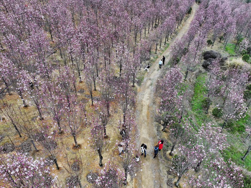 بكين 9 مارس 2025 (شينخوا) في الصورة الملتقطة جوا يوم 8 مارس 2025، زوار يستمتعون بأوقات فراغهم بين زهور ماغنوليا في محافظة قونغتشنغ ذاتية الحكم لقومية ياو في منطقة قوانغشي ذاتية الحكم لقومية تشوانغ في جنوبي الصين.