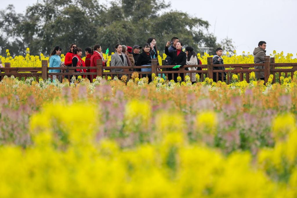 بكين 9 مارس 2025 (شينخوا) في الصورة الملتقطة يوم 8 مارس 2025، زوار يستمتعون بأوقات فراغهم بين الزهور في قرية قاوشين في مدينة ييبين بمقاطعة سيتشوان في جنوب غربي الصين.